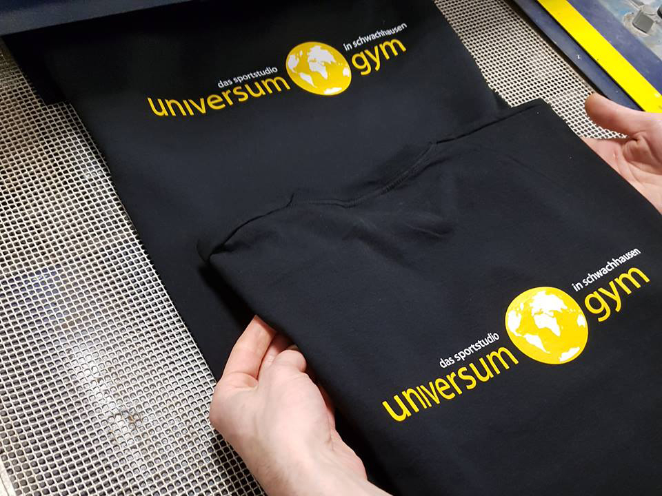 Bei mehrfarbigen Motiven, wird jede Farbe kurz zwischengetrocknet. Ist Ihr Motiv vollständig auf das Textil gedruckt, wird es in einem speziellen Ofen getrocknet. Jetzt ist die Veredelung fertig - und das ohne Einsatz von Klebern, Weichmachern oder Textilgrundierungen.